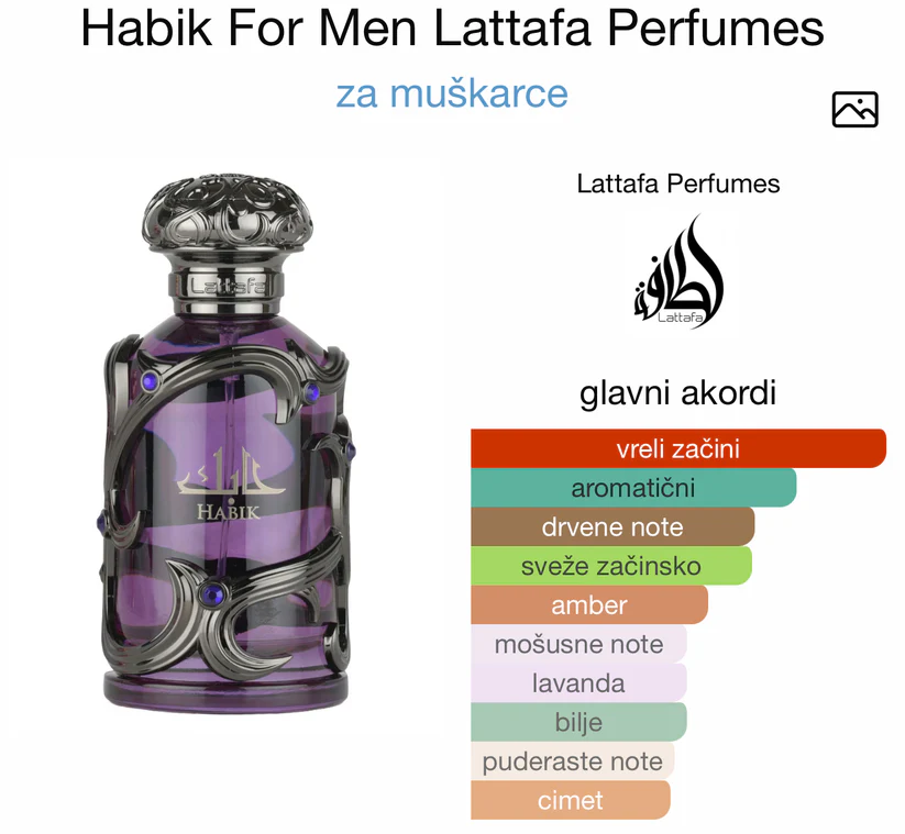 Habik For Men od Lattafa Perfumes je drveni aromatični miris za muškarce. Ovo je novi parfem. Habik For Men je predstavljen 2025. Gornje note su Kardamon, Biber, Artemizija i Bergamot; srednje note su lavanda, Cimet i Žalfija; bazne note su Mahune Tonke, mošus, Sandalovo drvo, Amberwood i pačuli.